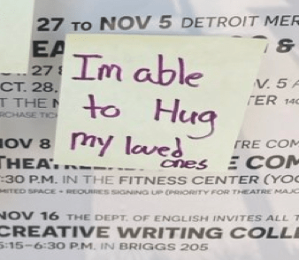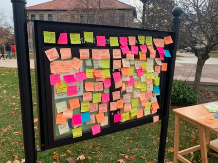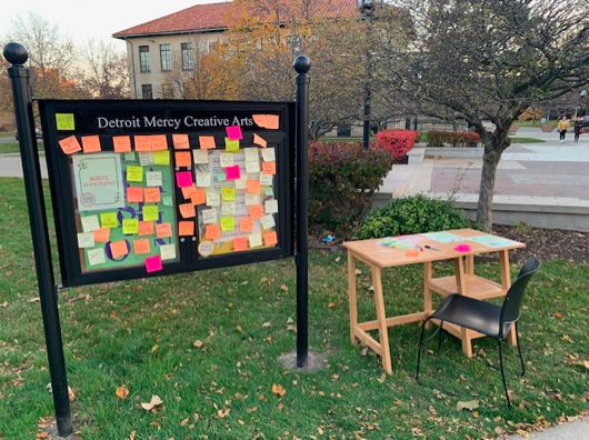 As time progressed, the Kiosk became as covered as that full dining table but with sweet and wholesome sentiments. All of the colorful sticky notes, each stamped by a unique handwriting and individualized message. They were all meticulously placed in a perfect spot, and this began to represent the diversity of the University of Detroit Mercy. Each personalized square tells a story of how the writer interprets life from a kind and gracious outlook. One sticky note read “I’m grateful for the people I have in my life,” another said “Everything happens for a reason!” and someone added “My family and friends.” Some have encountered amazing people, some find peace in the belief of fate or karma, and others think the world of their loved ones. Each of these messages is layered and reveals something vulnerable about the person. They allow those swiftly passing by to read one of the most cherished aspects of people’s lives. It is a heartwarming and comforting feeling to not only share those aspects of our lives, but to also be able to relate and connect with the sentiments of others.