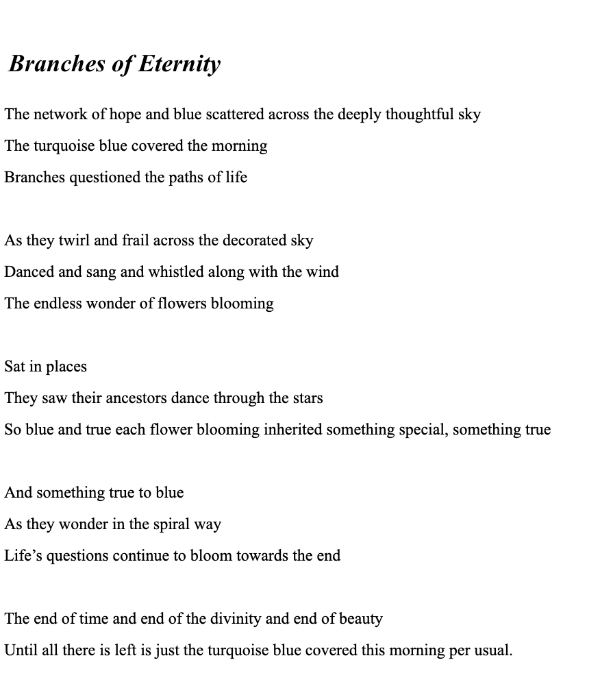 I am drawn to the blossoms of van Gogh’s painting, and the approach I took in writing my ekphrastic poem was to focus on the connection I experience when looking at it, and to leave this behind as an artist. I love blues because they remind us of moments when one may feel lost, but also because they create wonder. The focus here is on escaping into endless wonder. The collaboration between the painter and the artist-of-words is why I think ekphrastics can be exciting. Jannath Aurfan ’25