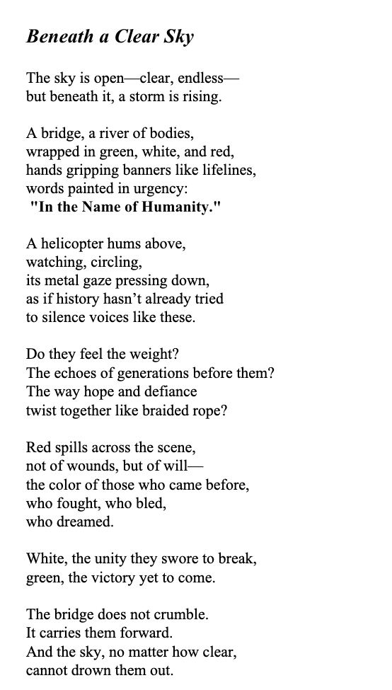 I chose Jake Crandall’s photograph (from social media), which captured a powerful protest scene that reminded me of immigrant rights rallies happening at the time. The image spoke to me as a moment of hope, unity, and strength. For my poem, I focused on the emotions of the people in the image—their frustration, pride, and fight for a better future. Ekphrastic poetry allows readers to connect with art, reflect on history and fairness, and consider the world we want to create together. Michelle Gomez-Angeles ’27