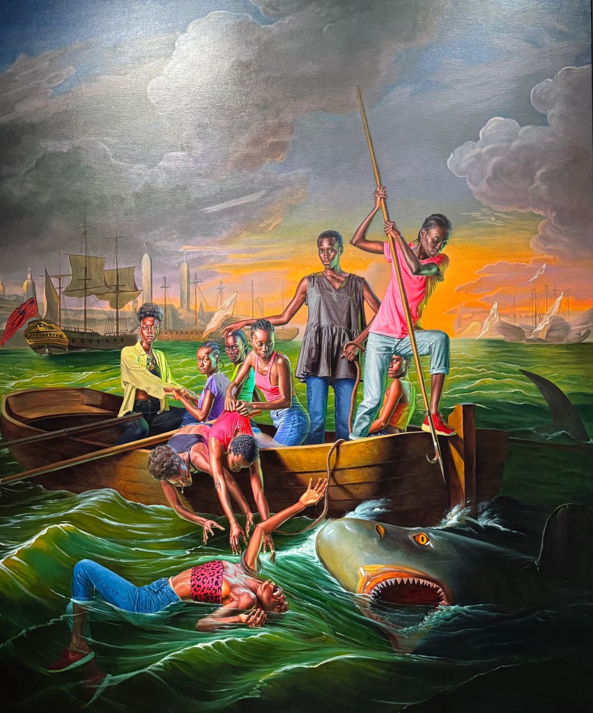 When comparing the two, I immediately noticed how the subjects of Wiley’s painting were positioned differently. While in Wiley’s painting the women are still fighting that same shark featured in Copley’s, I noted that they were kind of “detached,” staring straight at the viewer. They are not “in” the scene, as if they are aware they are in a painting and not too terribly concerned with the situation unfolding around them. I also thought it was interesting Wiley decided to use Senegalese women in particular, though it is explained that he wanted to include more diversity in art. I also wonder why he decided to dress them in plain, modern clothing.