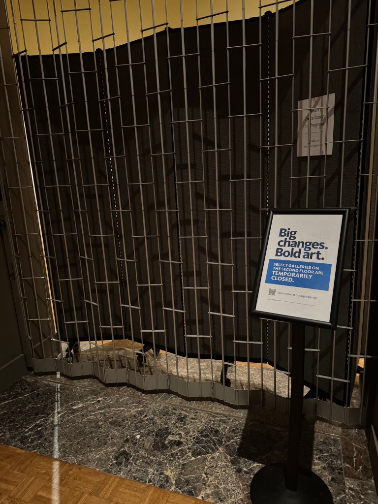 In the Contemporary section on the South Wing of floor 2 of the Detroit Institute of Arts (DIA), there is a large painting titled Officer of the Hussars (2007) by Kehinde Wiley. It is a really baroque looking piece, with a burgundy background, a regal gold frame, and gold leaves in swirling patterns. In the middle, there is a black man with a sword riding a horse. Despite the piece’s baroqueness, the background has a desert/western plateau type land formation, which is an interesting blend between the vibes of the Renaissance and the American West. The little plaque next to it explains that it is indeed inspired by a European piece of a military hero on horseback, and its attempt was to represent black men in Western art history, as it is rare to see.