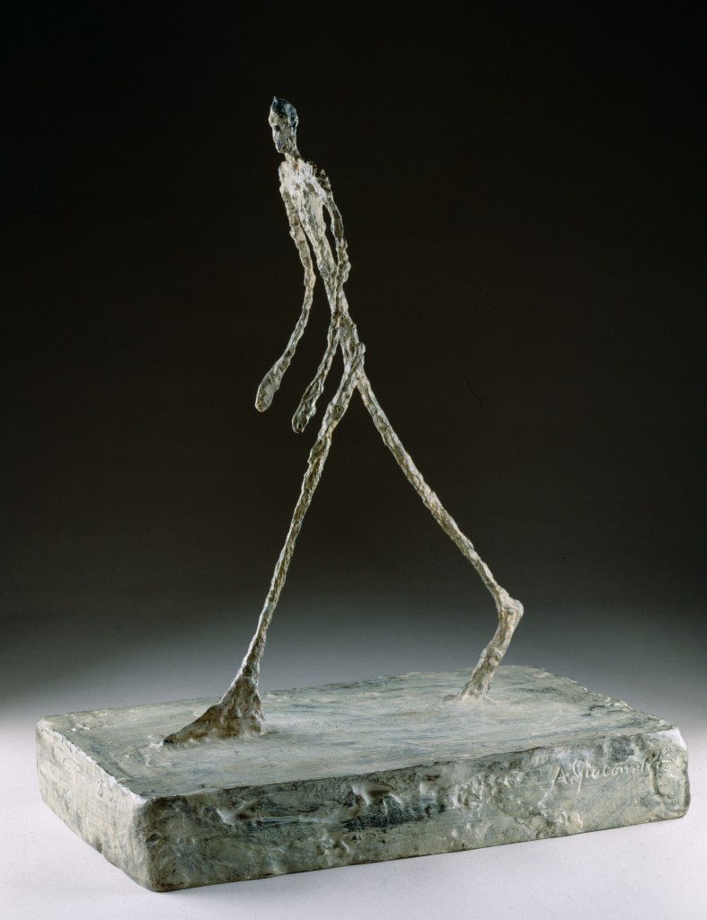 Hanging in the “Modern” section of the DIA is Man Crossing a Square on a Sunny Morning (1950) by Alberto Giacometti. This is painted bronze and is placed on a wood slab. It is a sculpture of a very skinny man walking on a stone slab. His feet are oddly long, the only colours are grey and brown/bronze.
