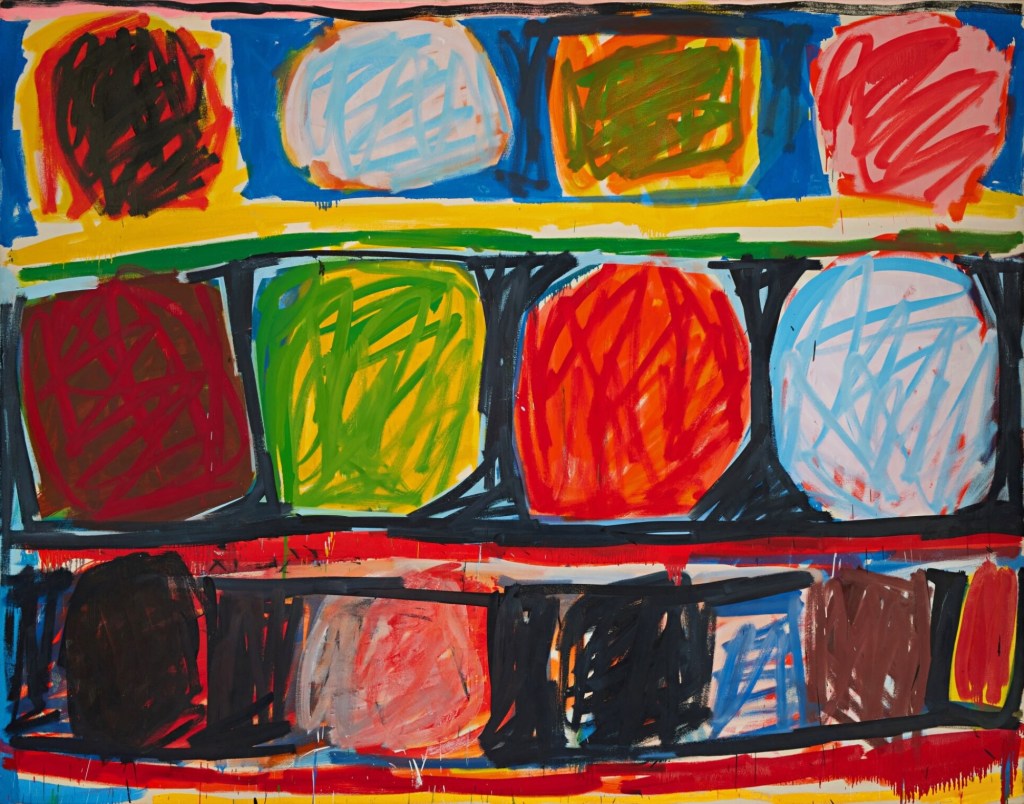 Featured in the Contemporary section with the focus on “Asserting Black Humanity” at the Detroit Institute of Arts (DIA), Radical Openness (1992) by Stanley Whitney (according to the artwork’s description) depicts the numerous variations that arise from working “with and within the grid.” With the use of complementary colors, there are irregular shapes that resemble circles and squares. In Whitney’s work, there is the use of flatness with “random” scribbles in each of the shapes and across the painting.