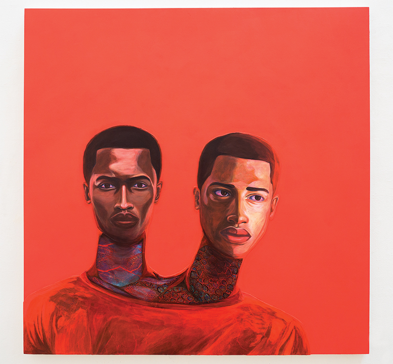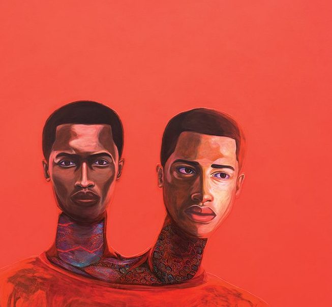 Featured in the “Asserting Black Humanity” section of the Detroit Institute of Arts (DIA), I grew an extra head to watch over my brother (The Middle of Nowhere) (2018) by Vaughn Spann depicts an individual with two heads. One person is staring directly at the viewer, the other to the side, and there are interesting details on their necks, which resemble blood vessels. The background, their shirt and veins are all shades of red.
