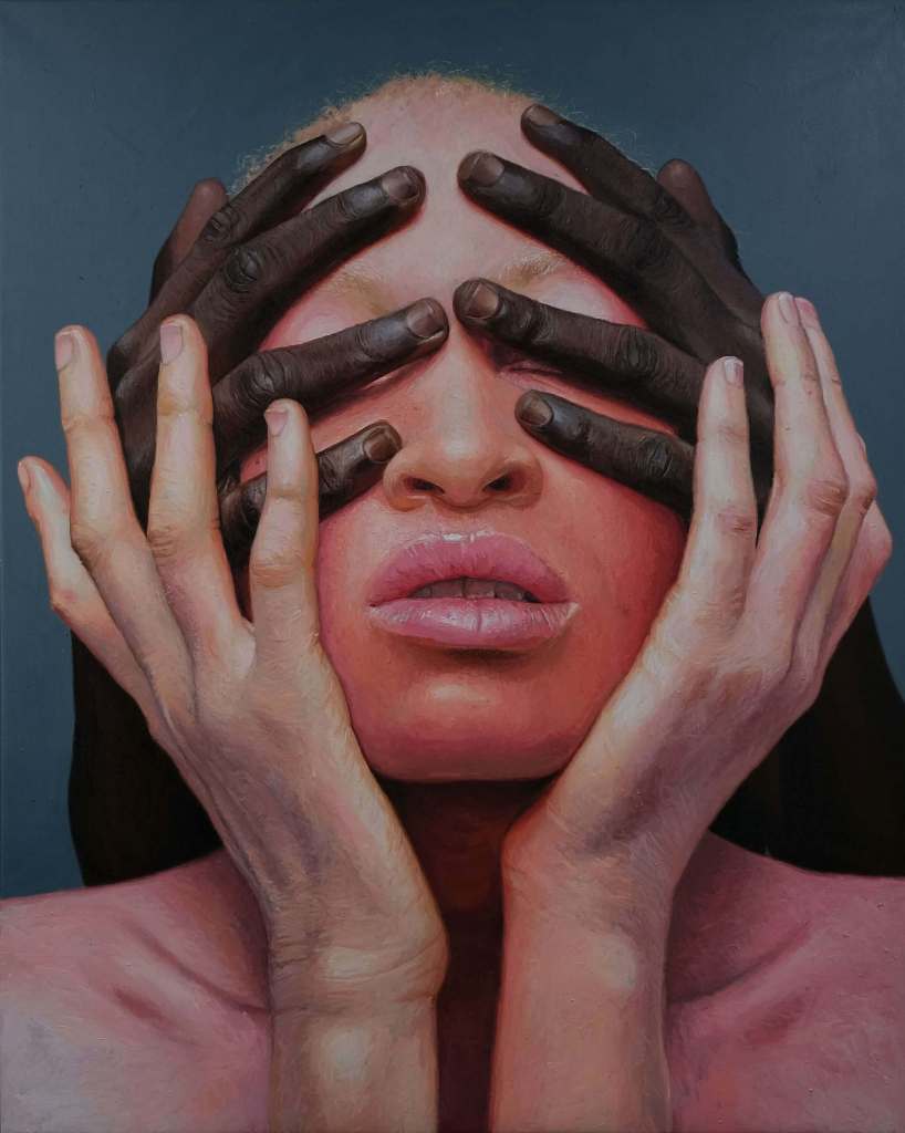 Displayed in the “Asserting Black Humanity” section of the Contemporary gallery of the DIA, White Ebony (2021) by Idowu Oluwaseun portrays an albino woman whose face is gently touched by two darker-skinned hands. The painting realistically captures detailed textures of skin, hair, and hands. This piece raises awareness of colorism by showing how internalized discrimination affects unity in the Black community. Oluwaseun explains in the work’s description, “The Black community has to come together as one . . . and we should stay united.”