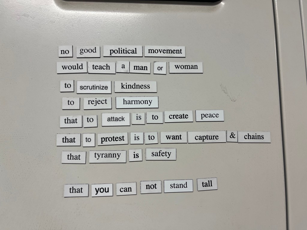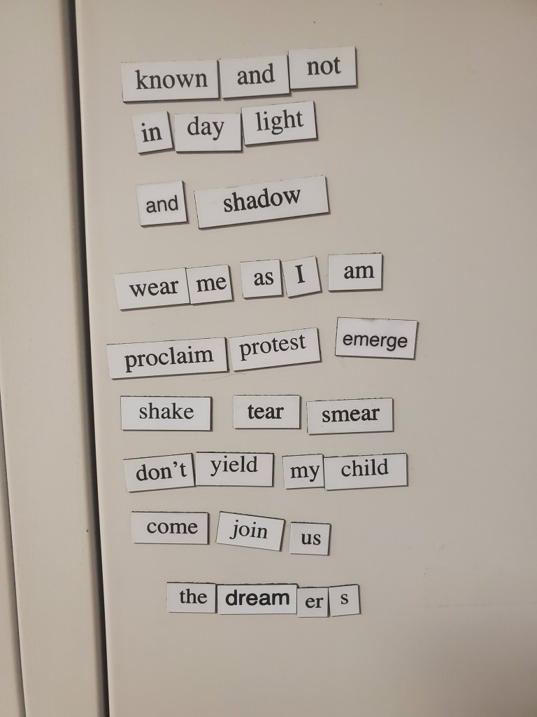 For the second year, UDM’s English Department sponsored a Magnetic Poetry Contest on the 2nd floor of Briggs. Students, faculty, staff, passers-by, all were invited to try their hand at original compositions using the building blocks of poetry: words on the page locker! Read the winning student poems below.