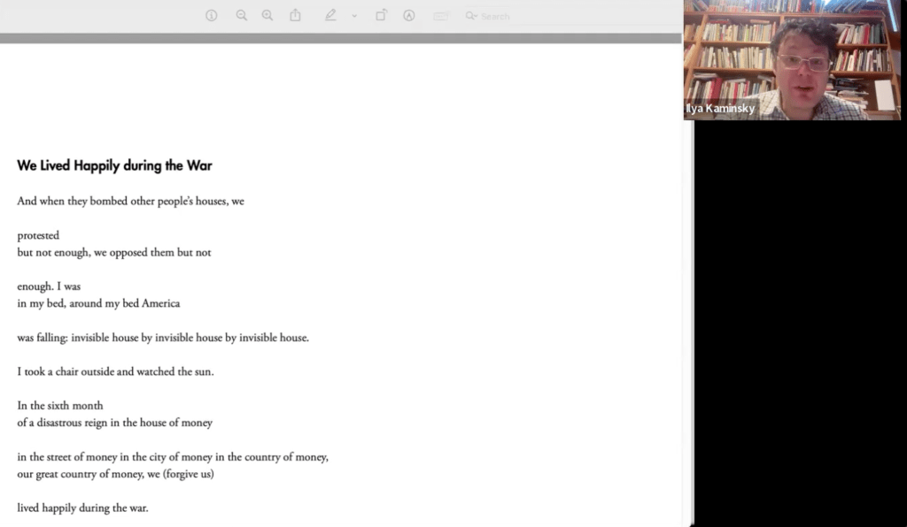 In order to help us grasp, to feel, Ilya Kaminsky opened the portal first to Eastern Europe, into a landscape where the alphabet is a soldier drafted into service. He spoke to us, explaining that the war in Eastern Europe is a war against the humanities. In the cold logic of conflict, the scientist may flee to the laboratories of Paris, yet the museum worker, the teacher, and the poet remain in the crosshairs of Odessa, Kaminsky’s hometown. In Odessa, Kaminsky narrates, those who stay, stay to guard the culture, and in staying, they are “bombed, and bombed, and bombed.”