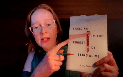 Farris then took ahold of our hands, reading from Standing in the Forest of Being Alive, a collection born in the shadow of a 2020 breast cancer diagnosis. Farris, using a similar metaphor as Kaminsky, writes that, on the morning of her port surgery, the operating room was a theater, and cancer was a stage play with a cruel progression. Her poems themselves are palimpsests, vellum made of animal skin that has been washed and rewritten, yet retaining the ghosts of what was erased. Within her work, she shocked me by drawing a startling parallel between the harboring of an unborn child and the harboring of a tumor, both “rapidly dividing cells held close to the heart.”